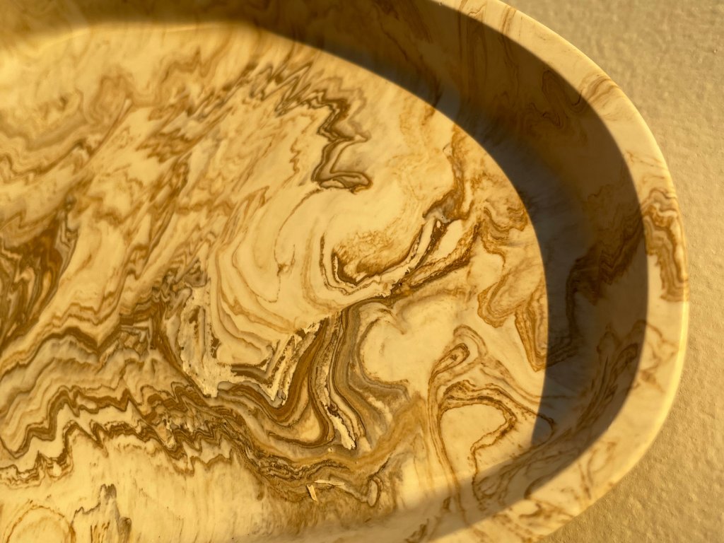 Každý výrobek je ručně litý z jemného minerálního kompozitu (Jesmonite), ručně barvený a broušený. Tento materiál je známý svou odolností a sametovým povrchem, který působí tepleji než beton či kámen.