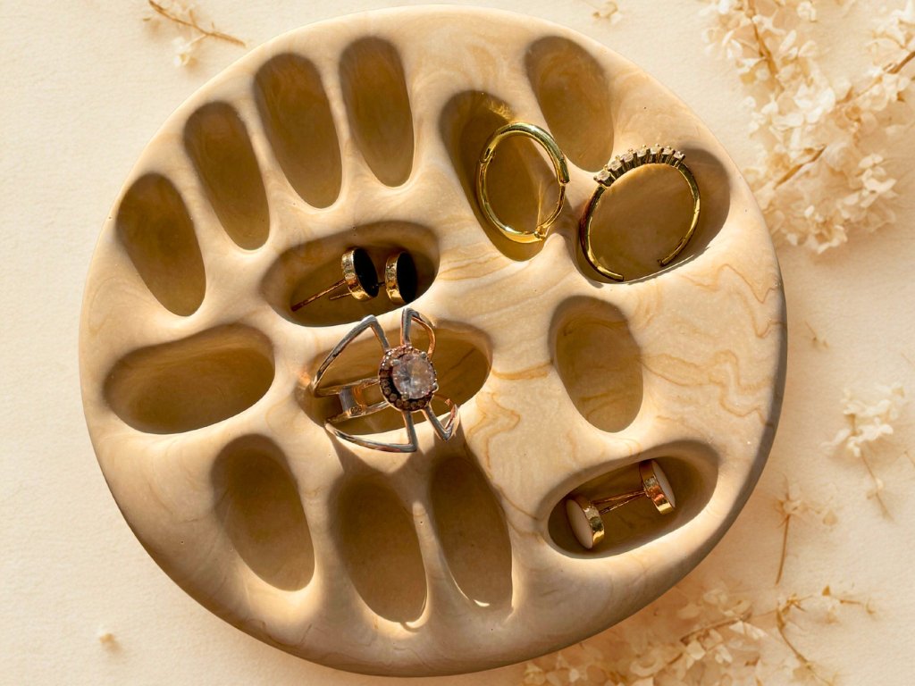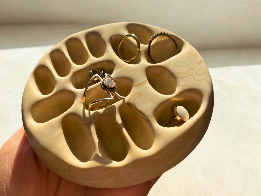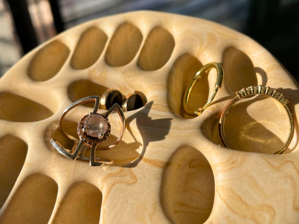 Stojan na šperky organického tvaru, který dá prstýnkům, náušnicím i řetízkům vlastní místo.