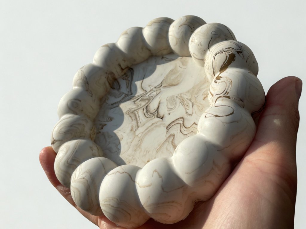 Každý výrobek je ručně litý z jemného minerálního kompozitu (Jesmonite), ručně barvený a broušený. Tento materiál je známý svou odolností a sametovým povrchem, který působí tepleji než beton či kámen. Díky tomu se výborně hodí do interiéru.